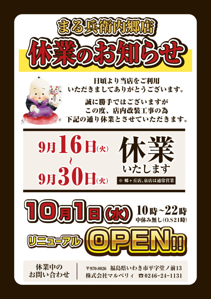 【熟成とんかつ まる兵衛 内郷店】リニューアルオープンのお知らせ